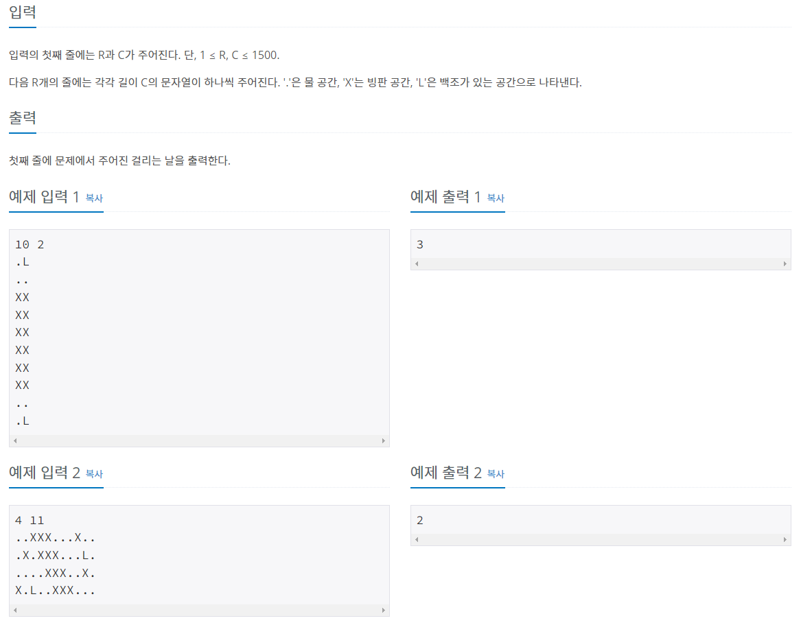 입력의 첫째 줄에는 R과 C가 주어진다. 단, 1 ≤ R, C ≤ 1500. 다음 R개의 줄에는 각각 길이 C의 문자열이 하나씩 주어진다. '.'은 물 공간, 'X'는 빙판 공간, 'L'은 백조가 있는 공간으로 나타낸다.