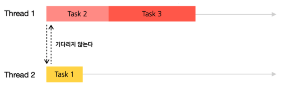 위 그림을 보면, Thread 1에서 Thread 2에게 Task를 보낸 경우, Thread 1은 대기 없이 나머지 Task를 실행한다.