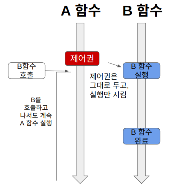 위 그림을 보면, A 함수가 B 함수를 호출하면, B 함수가 실행되지만 제어권은 A 함수가 그대로 가지고 있다. 그렇기 때문에 B 함수를 호출한 뒤에도 A 함수는 실행을 멈추지 않고 작업을 계속 수행한다.