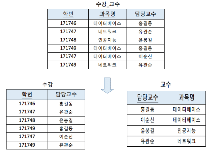 위 그림에서 '수강_교수' 테이블은 다음과 같은 함수적 종속을 만족하고 있다.