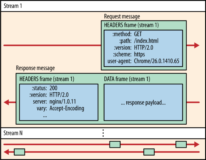 새로운 메커니즘(Binary Framing)이 도입됨에 따라 클라이언트와 서버 간의 데이터 교환 방식이 바뀌었다. 이 과정을 설명하기 위해 HTTP 2.0 용어를 살펴보자.