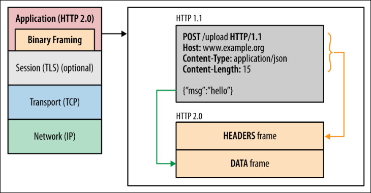 - HTTP 메시지 전송 방식의 변화 : Binary Framing 계층 사용